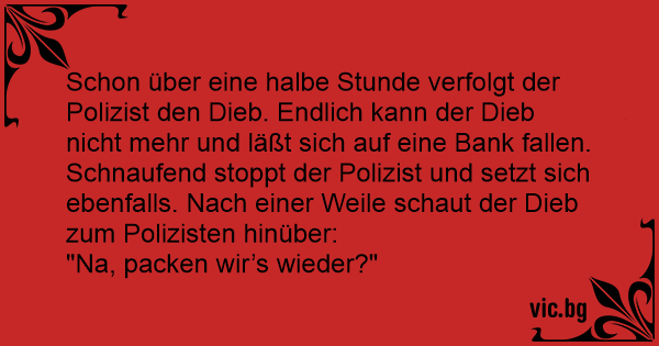 Schnaufend stoppt der Polizist und setzt sich ebenfalls. Nach einer Weile schaut der Dieb zum Polizisten hinüber: