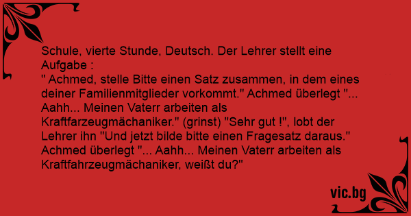" Achmed, stelle Bitte einen Satz zusammen, in dem eines deiner Familienmitglieder vorkommt." Achmed überlegt "... Aahh... Meinen Vaterr arbeiten als Kraftfarzeugmächaniker." (grinst) "Sehr gut !", lobt der Lehrer ihn "Und jetzt bilde bitte einen Fragesatz daraus." Achmed überlegt "... Aahh... Meinen Vaterr arbeiten als Kraftfahrzeugmächaniker, weißt du?"