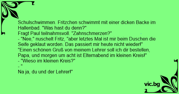 Schulschwimmen. Fritzchen schwimmt mit einer dicken Backe im Hallenbad. "Was hast du denn?"