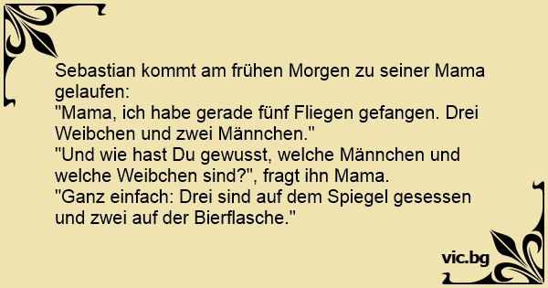 Jantje heeft twee vliegen gevangen en zegt tegen zijn moeder “Volgens mij is het een mannetje en een vrouwtje” Zijn moeder kijk verbaast en vraagt “Hoe kan je dat nou weten Jantje?” Waarop Jantje...