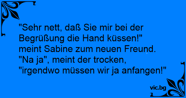 "Sehr nett, daß Sie mir bei der Begrüßung die Hand küssen!" meint Sabine zum neuen Freund. "Na ja", meint der trocken, "irgendwo müssen wir ja anfangen!"