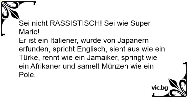 Du må ikke være racistisk, vær ligesom Mario. Han er en italiensk blikkenslager, der blev lavet af japanere, taler engelsk, ligner en mexicaner, hopper som en sort mand, og griber mønter som en Jøde!