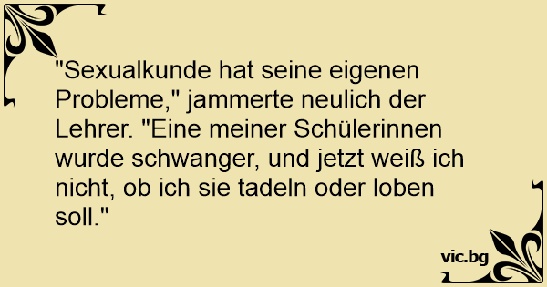 "Sexualkunde hat seine eigenen Probleme," jammerte neulich der Lehrer. "Eine meiner Schülerinnen wurde schwanger, und jetzt weiß ich niсhт, ob ich sie tadeln oder loben soll."