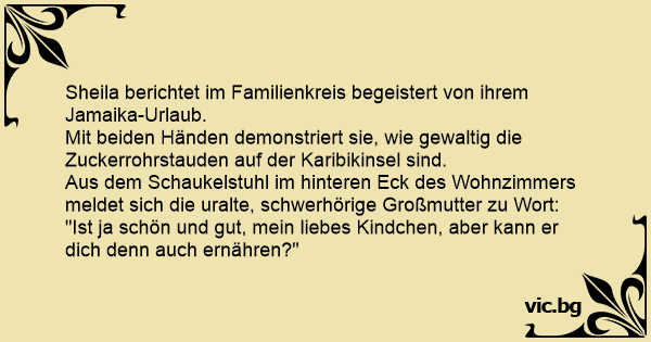 Sheila berichtet im Familienkreis begeistert von ihrem Jamaika-Urlaub.