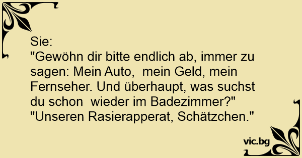 "Gewöhn dir bitte endlich ab, immer zu sagen: Mein Auto, mein Geld, mein Fernseher. Und überhaupt, was suchst du schon wieder im Badezimmer?"