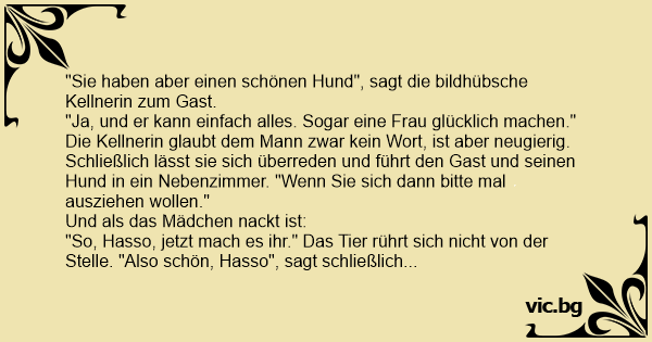 "Ja, und er kann einfach alles. Sogar eine Frau glücklich machen." Die Kellnerin glaubt dem Mann zwar kein Wort, ist aber neugierig. Schließlich lässt sie sich überreden und führt den Gast und seinen Hund in ein Nebenzimmer. "Wenn Sie sich dann bitte mal ausziehen wollen."