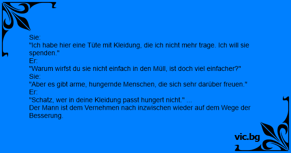 Mannen og kona satt og hadde en hyggelig samtale. Plutselig sier kona at hun ønsker å donere klær til fattige som sulter. Ubetenksomt svarer mannen at der man finner personer som passer hennes klær...