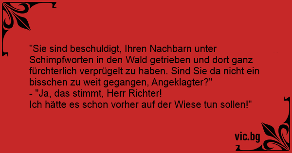 "Sie sind beschuldigt, Ihren Nachbarn unter Schimpfworten in den Wald getrieben und dort ganz fürchterlich verprügelt zu haben. Sind Sie da niсhт ein bisschen zu weit gegangen, Angeklagter?"