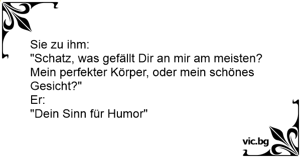 Fragt die Ehefrau ihren Gatten : Was magst du mehr, meinen wunderschönen Körper oder meine überragende Intelligenz? Ehemann (nach kurzer Überlegung) : Eher deinen Sinn für Humor.