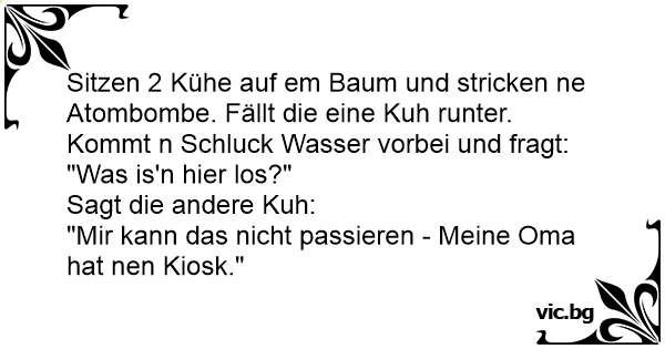 Sitzen 2 Kühe auf em Baum und stricken ne Atombombe. Fällt die eine Kuh runter. Kommt n Schluck Wasser vorbei und fragt:
