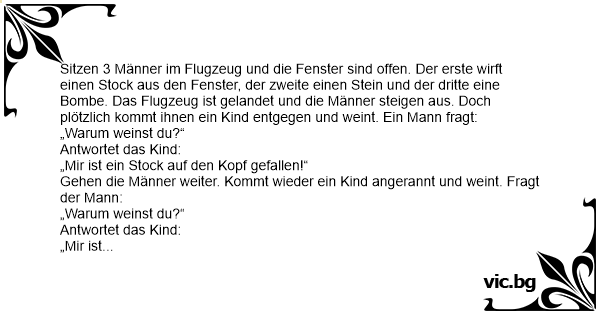 Sitzen 3 Männer im Flugzeug und die Fenster sind offen. Der erste wirft einen Stock aus den Fenster, der zweite einen Stein und der dritte eine Bombe. Das Flugzeug ist gelandet und die Männer steigen aus. Doch plötzlich kommt ihnen ein Kind entgegen und weint. Ein Mann fragt: