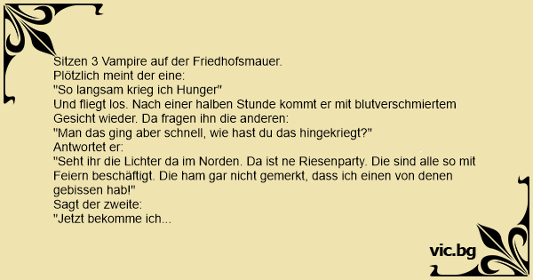 "Seht ihr die Lichter dort im Westen. Da ist auch ne Hochzeit und die sind alle so zu, dass die gar niсhт gemerkt haben, dass ich die Braut gebissen habe."