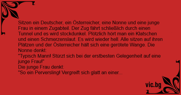 In einem Eisenbahn-Abteil sitzen eine umwerfende Blondine, eine Nonne, ein Holländer und ein Deutscher. Der Zug fährt in einen Tunnel und man hört den Knall einer Ohrfeige. Mit roter Wange sieht...