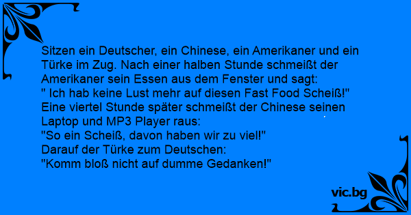 Пътуват в едно и също купе китаец, американец, немец и турчин.