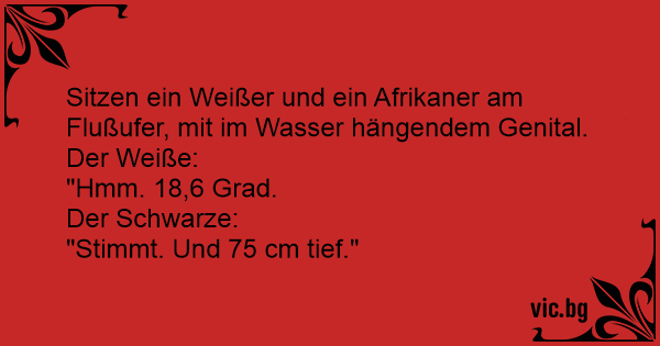 Auf einer Poolparty treffen sich ein schwarzer und ein weißer Mann. Nach mehreren Drinks steht der Weiße auf, zieht seine Hose aus, hält seinen Penis ins Wasser und sagt cool: "Exakt 22,04 Grad...
