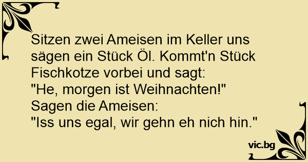 Sitzen zwei Ameisen im Keller uns sägen ein Stück Öl. Kommt'n Stück Fischkotze vorbei und sagt: