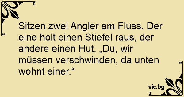 Sitzen zwei Angler am Fluss. Der eine holt einen Stiefel raus, der andere einen Hut. „Du, wir müssen verschwinden, da unten wohnt einer.“