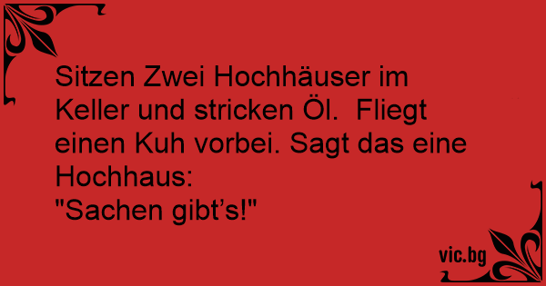 Sitzen Zwei Hochhäuser im Keller und stricken Öl. Fliegt einen Kuh vorbei. Sagt das eine Hochhaus: