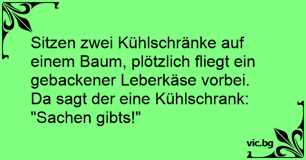 Sitzen zwei Kühlschränke auf einem Baum, plötzlich fliegt ein gebackener Leberkäse vorbei. Da sagt der eine Kühlschrank: