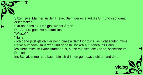 Sitzen zwei Männer an der Theke. Sieht der eine auf die Uhr und sagt ganz erschrocken: