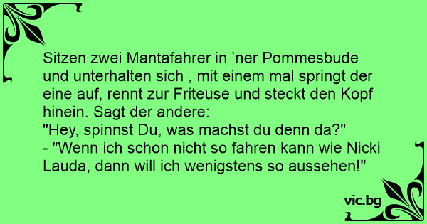 Sitzen zwei Mantafahrer in ’ner Pommesbude und unterhalten sich , mit einem mal springt der eine auf, rennt zur Friteuse und steckt den Kopf hinein. Sagt der andere: