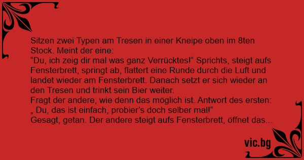 Gesagt, getan. Der andere steigt aufs Fensterbrett, öffnet das Fenster und springt. 20m tiefer lag er nun auf der Straße - aus, vorbei, Matschebrei