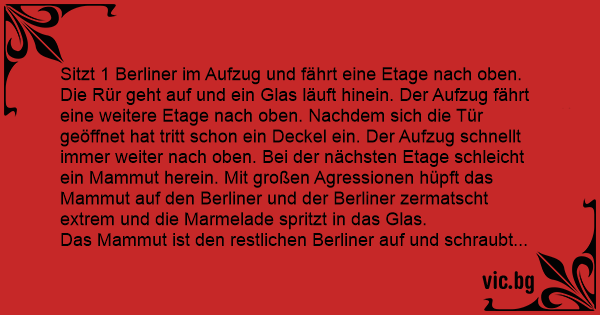 Sitzt 1 Berliner im Aufzug und fährt eine Etage nach oben. Die Rür geht auf und ein Glas läuft hinein. Der Aufzug fährt eine weitere Etage nach oben. Nachdem sich die Tür geöffnet hat tritt schon ein Deckel ein. Der Aufzug schnellt immer weiter nach oben. Bei der nächsten Etage schleicht ein Mammut herein. Mit großen Agressionen hüpft das Mammut auf den Berliner und der Berliner zermatscht extrem und die Marmelade spritzt in das Glas.