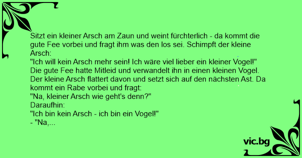 Sitzt ein kleiner Аrsсh am Zaun und weint fürchterlich - da kommt die gute Fee vorbei und fragt ihm was den los sei. Schimpft der kleine Аrsсh: