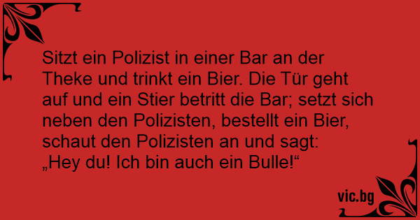 Sitzt ein Polizist in einer Bar an der Theke und trinkt ein Bier. Die Tür geht auf und ein Stier betritt die Bar; setzt sich neben den Polizisten, bestellt ein Bier, schaut den Polizisten an und sagt: