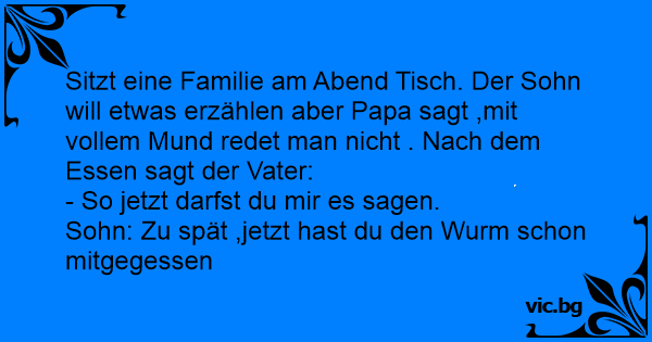 Sitzt eine Familie am Abend Tisch. Der Sohn will etwas erzählen aber Papa sagt ,mit vollem Mund redet man niсhт . Nach dem Essen sagt der Vater: