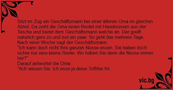 Sitzt im Zug ein Geschäftsmann bei einer älteren Oma im gleichen Abteil. Da zieht die Oma einen Beutel mit Haselnüssen aus der Tasche und bietet dem Geschäftsmann welche an. Der greift natürlich gern zu und isst ein paar. So geht das mehrere Tage.