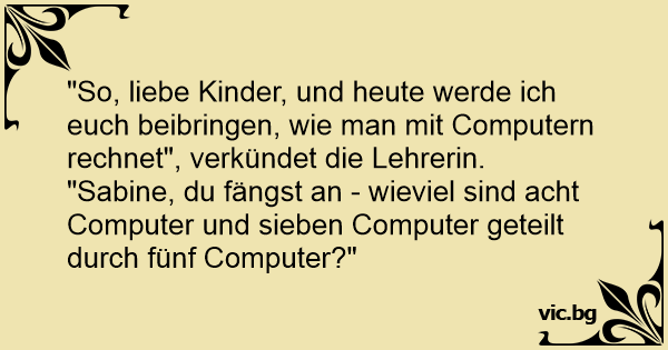 "So, liebe Kinder, und heute werde ich euch beibringen, wie man mit Computern rechnet", verkündet die Lehrerin. "Sabine, du fängst an - wieviel sind acht Computer und sieben Computer geteilt durch fünf Computer?"