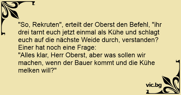 "Alles klar, Herr Oberst, aber was sollen wir machen, wenn der Bauer kommt und die Kühe melken will?"