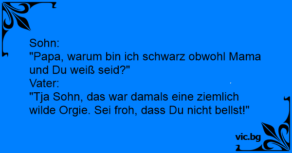 Дете пита майка си: Treffen sich zwei Frauen im Park, die eine hat einen Kinderwagen dabei. Негърче пита майка си: A little boy asked his mother: Mummy, why are you white and I am black? Don’t even ask me that, when I remember that party..., you are lucky that you don’t bark. Un ragazzino: - Mamma, come mai tu sei bianca e io sono nero? - Eh figlio mio, quando mi ricordo di quella festa..., meno male che non abbai. A little boy asks his Mum "why am I black and you are white ?" "Don't even ask," she replies "when I think back to that party... you are lucky that you not bark !" O garotinho vira-se para a mãe e pergunta: — Manhêêê! — O que é, seu pirralh..., digo, meu querido? — Se você é branca e o papai é negro, por que é que eu fui nascer com cara de japonês? — Ih, meu... Fragt die Frau den Arzt, wie denn ihr neugeborenes Kind aussehe. Antwortet der Arzt: "Ein blonder Schwarzer mit asiatischen Augen! Vielleicht sollten sie das nächste Mal besser aufpassen, wenn sie... Een blondje ligt op de verlostafel en het hoofdje van haar baby komt er uit. Warempel, het is zwart! De verpleegster vraagt: "Deed u het met een zwarte?" "Ja zei de blondine, maar eenmalig." Het... Fritzchen: Papa, Papa – warum sind du und Mama weiß und ich schwarz? Vater: Weißt du Sohn, die 68er waren eine verrückte Zeit. Sei froh, dass du nicht bellst. Mamo, mamo, a dlaczego ja jestem czarny, a Ty jesteś biała? - pyta dziecko mamę. - Ciesz się, że nie masz ogona i nie szczekasz - taka była impreza - odpowiada mama. - Apu, apu! Miért van az, hogy te is fehér vagy, anyu is fehér és én néger vagyok? - Hú, kisfiam erről inkább anyádat kérdezd! Odamegy a gyerek az anyjához: - Anyu, Anyu! Miért van az, hogy te is... Op het ziekenhuis is er juist een vrouw aan het bevallen. Eerst komt het kopje van de baby tevoorschijn, het ziet geel. De dokter vraagt: "Heb je het ooit met een chinees gedaan?" Waarop de dame... Pistike kérdezi az anyukáját: - Anya az mért van, hogy apa is, te is, az egész családban mindenki fehér, csak én vagyok fekete? - Kisfiam, ne kérdezz semmit! Amilyen buli volt, örülj, hogy nem... Mazs zēns jautā mammai: - Mamm, kāpēc es esmu melnādains, bet tu balta? - Labāk nejautā. Atceroties to ballīti.. esi laimīgs, ka nerej! Kisfiú odamegy az anyukájához: - Anyuci, az hogy van, hogy az oviban minden kisfiúnak fehér a bőre, és a szülei is fehérek. Én viszont fekete vagyok, viszont te fehér! Hogy lehet ez? - Hát,... Mommy, why am I asian when daddy is black and you are white? With how that night went just be thankful you are not barking Ρωτάει το παιδί τον πατέρα του : - Μπαμπά, γιατί εσύ είσαι άσπρος, η μαμά μου μαύρη και εγώ κίτρινος; Και του απαντάει ο πατέρας του: - Με την παρτούζα που έπεσε εκείνο το βράδυ, να ευχαριστείς που...