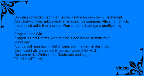 Sonntag vormittag nach der Kirche. Frühschoppen beim Fischerwirt. Alle Dorfwichtigen inklusive Pfarrer sitzen beisammen. Alle sind fröhlich, freuen sich auf´s Bier, nur der Pfarrer, der schaut ganz grießgrämig drein.