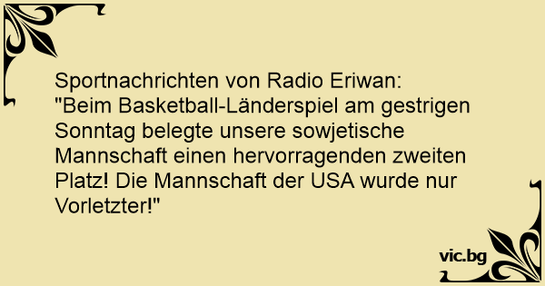 "Beim Basketball-Länderspiel am gestrigen Sonntag belegte unsere sowjetische Mannschaft einen hervorragenden zweiten Platz! Die Mannschaft der USA wurde nur Vorletzter!"