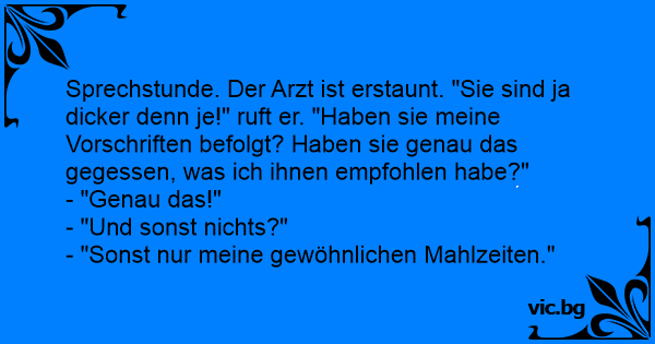 Sprechstunde. Der Arzt ist erstaunt. "Sie sind ja dicker denn je!" ruft er. "Haben sie meine Vorschriften befolgt? Haben sie genau das gegessen, was ich ihnen empfohlen habe?"