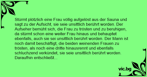 Stürmt plötzlich eine Frau völlig aufgelöst aus der Sauna und sagt zu der Aufsicht, sie seie unsittlich berührt worden. Der Aufseher bemüht sich, die Frau zu trösten und zu beruhigen, da stürmt schon eine weiter Frau hinaus und behauptet ebenfalls, auch sie sei unsittlich berührt worden. Der Mann ist noch damit beschäftigt, die beiden weinenden Frauen zu trösten, als noch eine dritte hinausrennt und ebenfalls schluchzend verkündet, sie seie unsittlich berührt worden.
