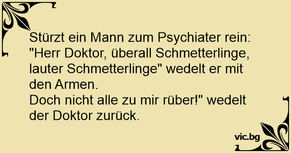 Kommt ein Mann zum Psychiater, wedelt wie verrückt mit den Armen und ruft: "Herr Doktor, helfen Sie mir! Schmetterlinge! Überall Schmetterlinge!" Da fängt der Psychiater auch an, mit den Armen zu...