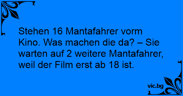 Stehen 16 Mantafahrer vorm Kino. Was machen die da? – Sie warten auf 2 weitere Mantafahrer, weil der Film erst ab 18 ist.