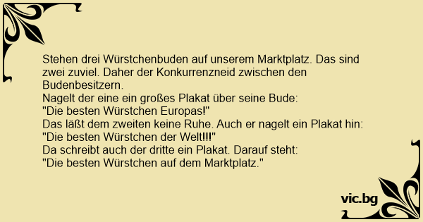 Stehen drei Würstchenbuden auf unserem Marktplatz. Das sind zwei zuviel. Daher der Konkurrenzneid zwischen den Budenbesitzern.