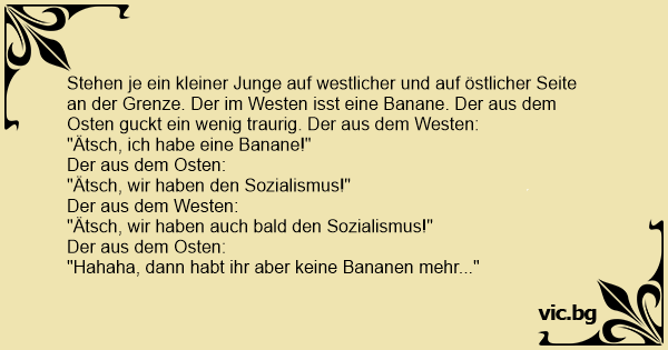 Stehen je ein kleiner Junge auf westlicher und auf östlicher Seite an der Grenze. Der im Westen isst eine Banane. Der aus dem Osten guckt ein wenig traurig. Der aus dem Westen: