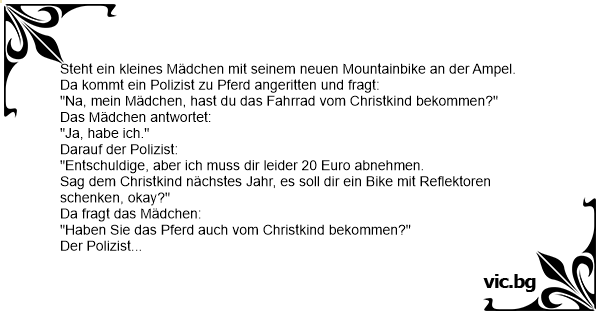 Ein kleines Mädchen fährt mit ihrem Fahrrad durch die Stadt und trifft einen berittenen Polizisten. Dieser fragt das Mädchen: Hat dir der Weihnachtsmann das Fahrrad geschenkt? Sie: Ja. Er: Dann sag...