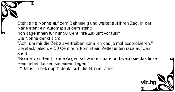 - "Der ist ja bekloppt!" denkt sich die Nonne, aber will es dennoch ausprobieren. Sie hebt das linke Bein und lässt prompt einen fliegen. Sie wirft wieder 50 Cent in den Automaten, kommt wieder ein Zettel unten raus: