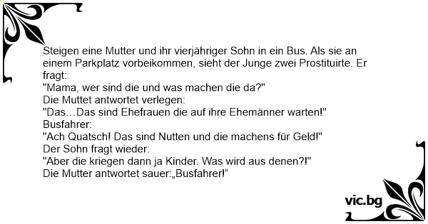 Eine Mutter mit Ihrer 9 Jährigen Tochter im Bus. An einer Haltestelle stehen Prostituierte und halten nach Kundschaft aus. Tochter: "Mama, was machen die da?" Mutter: "Das sind Ehefrauen und die...
