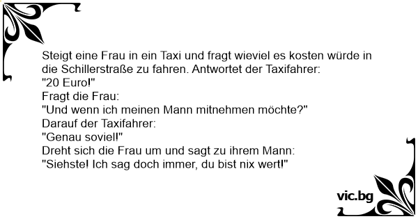 Steigt eine Frau in ein Taxi und fragt wieviel es kosten würde in die Schillerstraße zu fahren. Antwortet der Taxifahrer: