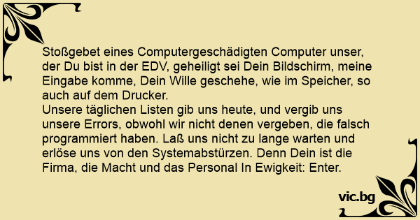 Stoßgebet eines Computergeschädigten Computer unser, der Du bist in der EDV, geheiligt sei Dein Bildschirm, meine Eingabe komme, Dein Wille geschehe, wie im Speicher, so auch auf dem Drucker.