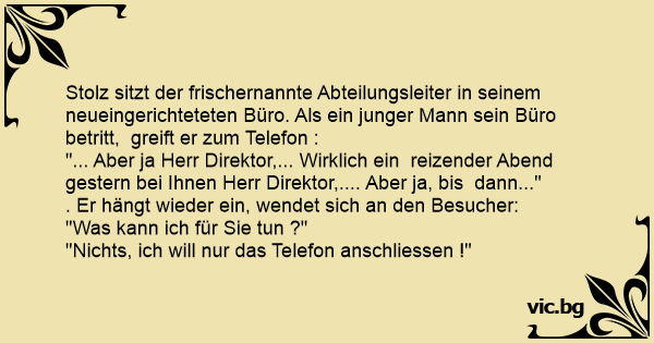 Stolz sitzt der frischernannte Abteilungsleiter in seinem neueingerichteteten Büro. Als ein junger Mann sein Büro betritt, greift er zum Telefon :