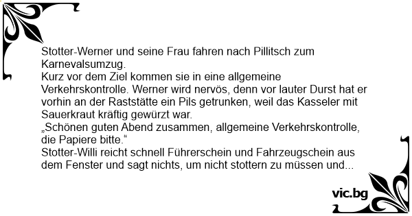Stotter-Willi reicht schnell Führerschein und Fahrzeugschein aus dem Fenster und sagt nichts, um niсhт stottern zu müssen und seine Bierfahne niсhт zu verraten.