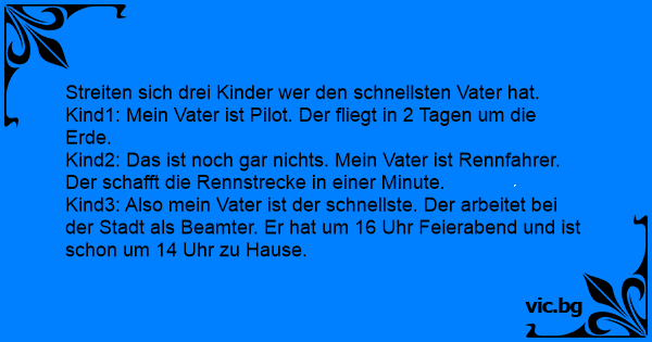 Drei Jungs streiten darüber, wessen Vater der schnellste ist. Der Erste: "Mein Vater ist Rennfahrer, der ist sicher der schnellste!" Der Zweite: "Vergiss es! Meiner ist Pilot, der ist viel schneller!" Der Dritte: "Nein, mein Papi ist noch schneller!" Die beiden anderen: "So, und wie macht er...